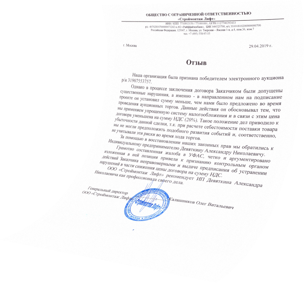 В стоимость входит: • правовой анализ ситуации; • сбор документов доказательной базы; • формирование письменных пояснений для УФАС; • помощь в подаче пояснений в УФАС посредством электронной почты; • определение стратегии и тактики защиты направленных пояснений; • защита интересов участника на заседании Комиссии УФАС.