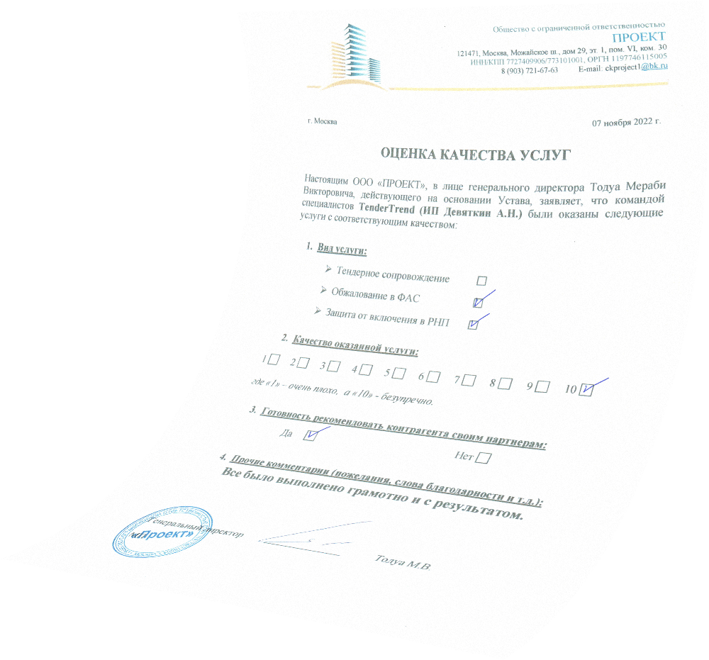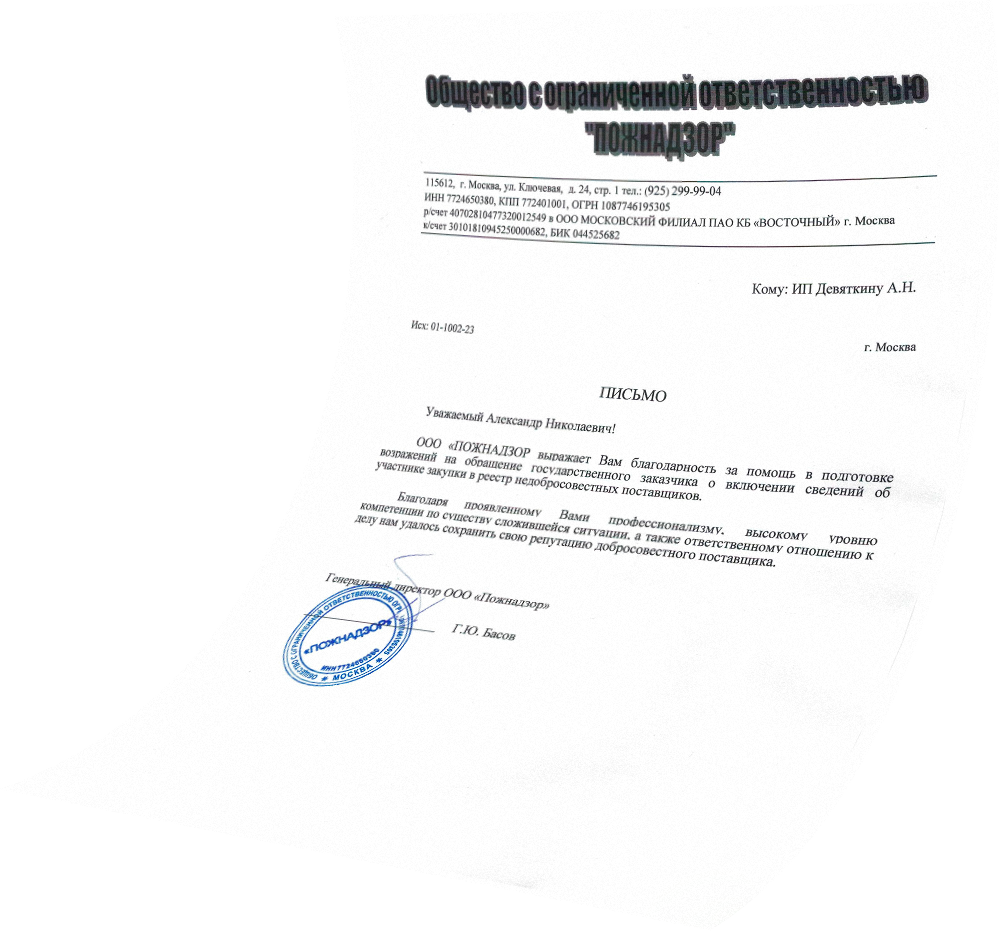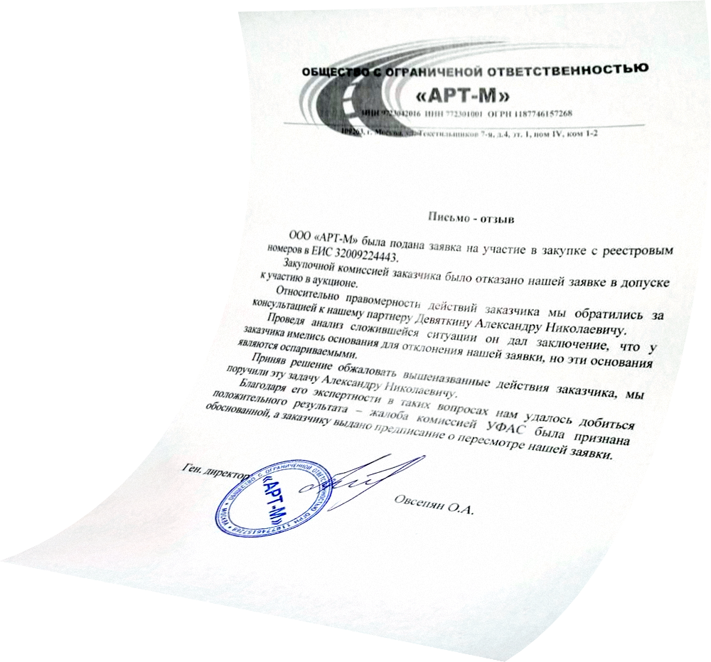 Мы специализируемся на обжаловании действий заказчиков в ФАС, защите участников от включения в РНП, взыскании просроченной задолженности.
